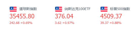 8月27日周五收盘,道指涨242.68点或0.69%,报35455.80点;标普500指数涨39.37点或0.88%,报4509.37点;纳指涨183.69点或1.23%,报15129.50点。