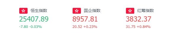 8月27日周五收盘,恒生指数跌7.8点或0.03%,报25407.89点,国企指数涨0.23%,报8957.81点,红筹指数涨0.84%,报3832.37点。