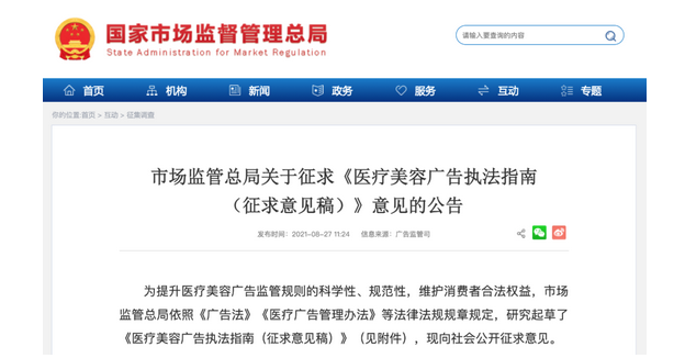近日 ,国家市场监管总局网站发布关于征求《医疗美容广告执法指南(征求意见稿)》意见的公告。意见稿提及,将重点打击制造“容貌焦虑”、利用广告代言人为医疗美容做推荐等广告乱象。