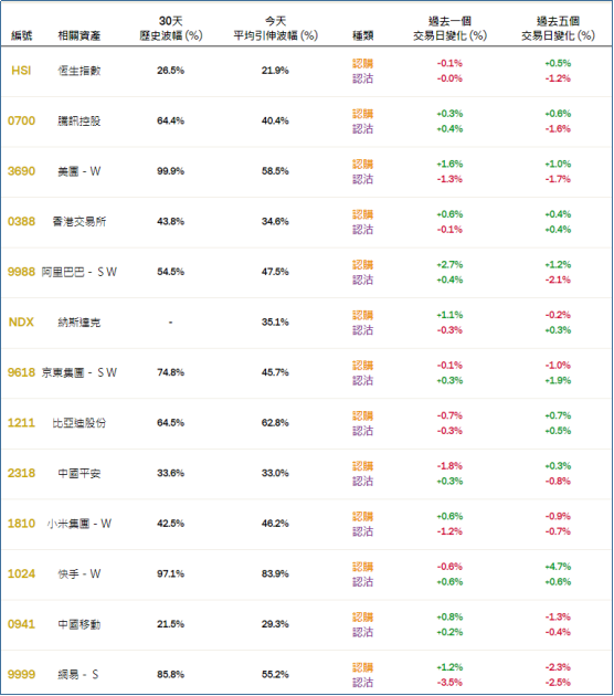 上周五恒指相关权证的平均引伸波幅报约21.9%,按日小幅下跌。个股方面,美团、阿里巴巴、纳斯达克等相关认购证的引伸波幅按日上升;美团、小米、网易等相关认购证的引伸波幅则按日下降。