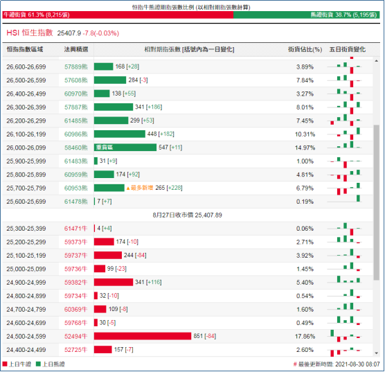 街货分布方面,至上周五,恒指牛证街货在收回价24500点至25000点之间,累计相当约1363张期指合约;恒指熊证街货在收回价26000点至26500点之间,相当约1773张期指合约。