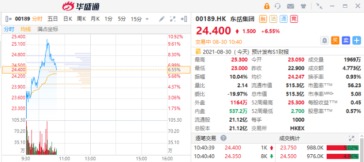 华盛资讯8月30日消息,东岳集团早盘一度涨超10%,现涨超6%,报24.4港元,最新市值515亿港元。该股本月累计涨超50%。