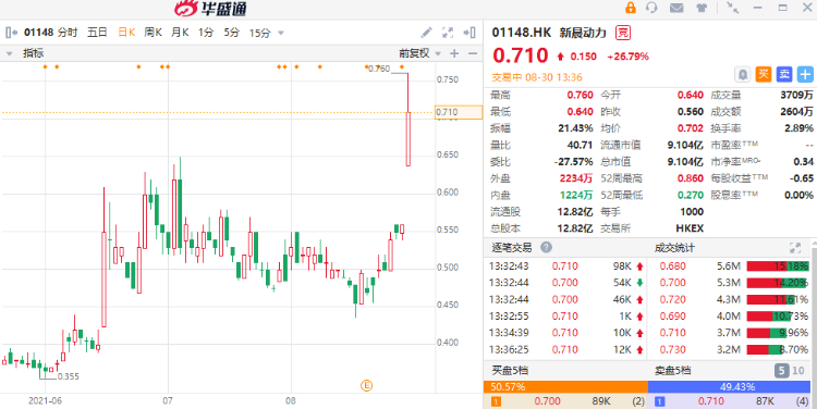 华盛资讯8月30日消息,新晨动力盘中一度涨超35%,截至发稿,涨26.79%,报0.71港元,成交额2604万港元。