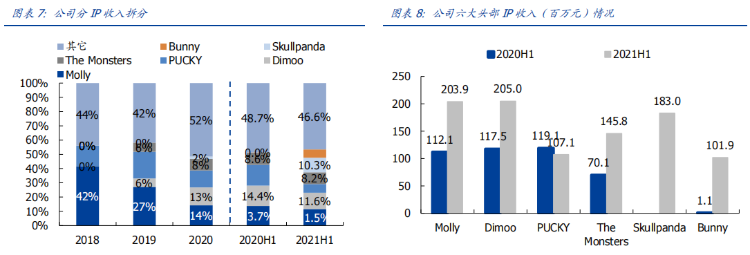 从收入占比来看,2021上半年泡泡玛特六大头部IP包括Molly(11.5%)、Dimoo(11.6%)、Pucky(6%)、The Monsters(8.2%)、Skullpanda(10.3%)、Bunny(5.7%)收入占比均未超过12%,其它IP收入占比高达46.6%。