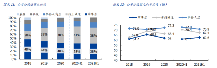 1、线下渠道:截至2021上半年零售店、机器人店数量分别为215、1477家,相比2020年末分别增加28、126家;实现营收 6.75亿元(同比增长115.5%)、2.27亿元(同比增长115.7%)。