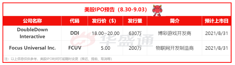 在沉寂了两周之后,美股IPO市场终于迎来新股上市。本周美股IPO市场预计将迎来2只新股,韩国博彩游戏开发商DoubleDown Interactive和物联网开发制造商Focus Universal Inc。