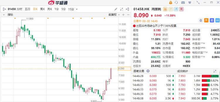 周黑鸭盘中涨超10%,近6日累计升幅达40%,现报8.09港元,最新总市值192.8亿港元。