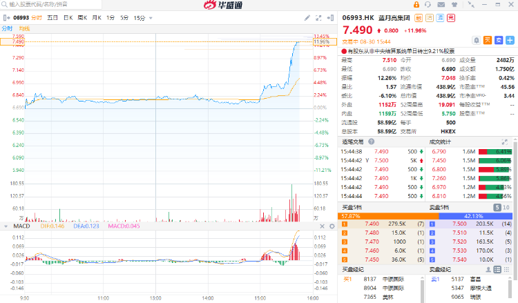 华盛资讯8月30日消息,蓝月亮集团尾盘强势拉涨11.96%,现报7.49港元,最新市值438.9亿港元,成交额1.75亿港元。