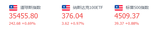 8月27日周五收盘,道指涨242.68点或0.69%,报35455.80点;标普500指数涨39.37点或0.88%,报4509.37点;纳指涨183.69点或1.23%,报15129.50点。