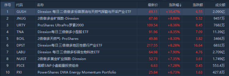 从ETF涨幅榜来看,涨幅居前的有2倍做多金矿指数 $JNUG 上涨8.88%;2倍做多黄金矿业指数 $NUGT 上涨7.35%。