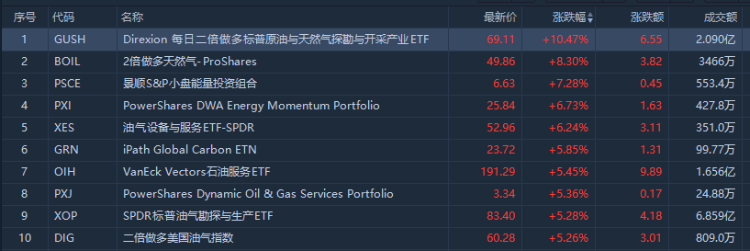 受相关消息影响,二倍做多标普原油与天然气勘探与开采产业ETF $GUSH 上涨10.47%;油气设备与服务 $XES 上涨6.24%。