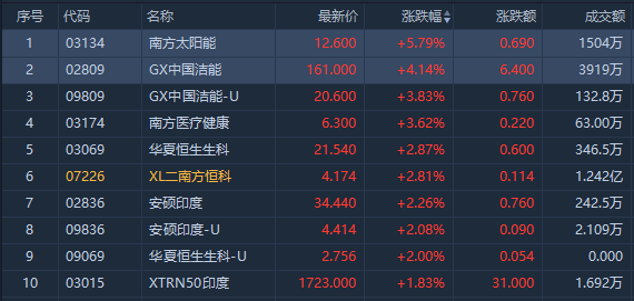 涨幅靠前的ETF有南方太阳能 $03134.HK 上涨5.79%,成交额达1504万港元;中国洁能 $02809.HK 上涨4.14%,成交额达3919万港元。