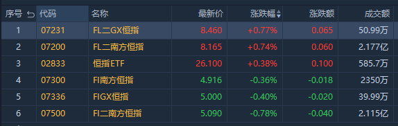 受消息影响,今日港股涨幅居前的ETF有GX两倍看多恒指 $07231.HK 上涨0.77%;南方两倍看多恒指 $07200.HK 上涨0.74%,成交额达2.177亿港元。
