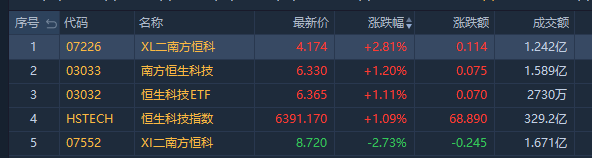 南方两倍做多恒科 $07226.HK 收涨2.81%,成交额1.242亿港元;