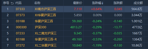沪深300指数收跌0.29%。其中华夏沪深300 $03188.HK 下跌0.24%,成交额达1.001亿港元。