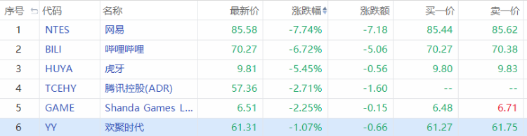 截至发稿,网易跌7.74%,报85.58美元;哔哩哔哩跌6.72%,虎牙跌5.45%,腾讯控股(ADR)跌2.71%。