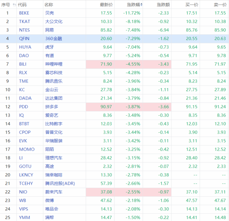 网易(NTES)、哔哩哔哩(BILI)、腾讯控股(ADR)(TCEHY)等游戏股分别跌7.48%、4.55%、2.66%;