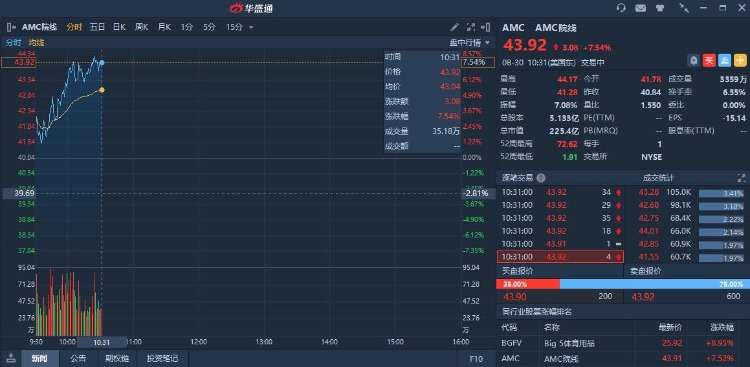 华盛资讯8月30日讯,WSB概念涨跌不一,AMC院线(AMC)股价走高,该股涨超7%。其他WSB概念股方面,游戏驿站(GME.US)涨超4%、黑莓(BB.US)跌超2%。