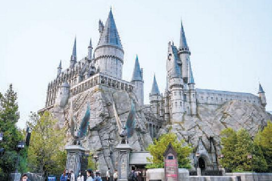 哈利波特的魔法世界景区,城堡吸引游客驻足。