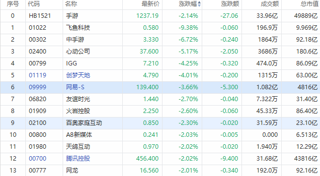 截至发稿,飞鱼科技跌9.38%;中手游跌6.72%;心动公司跌5.17%,股价现报37.6港元;网易-S跌3.66%,股价现报139.4港元,成交额1.08亿港元;创梦天地跌4.01%,网龙、IGG等跌逾2%;腾讯控股跟跌。