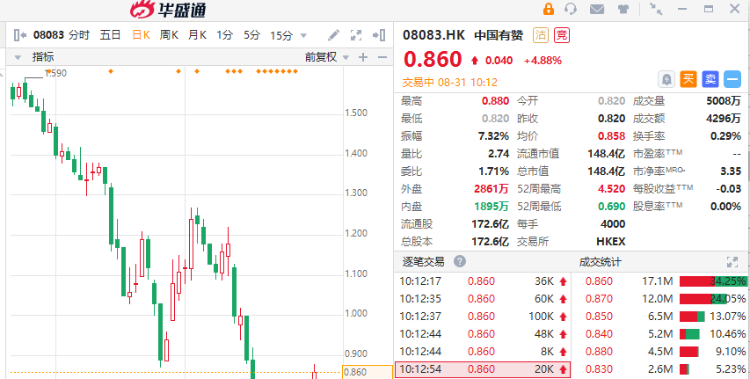 华盛资讯8月31日消息,中国有赞今日持续走高,现报0.86港元/股,最新总市值148.4亿,三日累计大涨近20%。据悉,旗下有赞科技将以发售新股方式于主板上市。