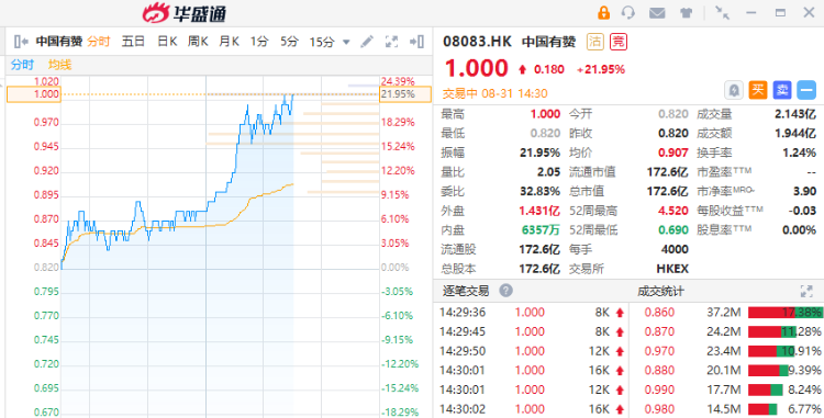 中国有赞(08083)午后涨幅扩大至21.95%,成交额超1.9亿港币;昨日首涨12.33%,两日累计涨幅已超30%,大幅领涨港股SaaS板块。公司最新市值超172.6亿港币,市值超越非凡中国,重回创业板市值“一哥”。