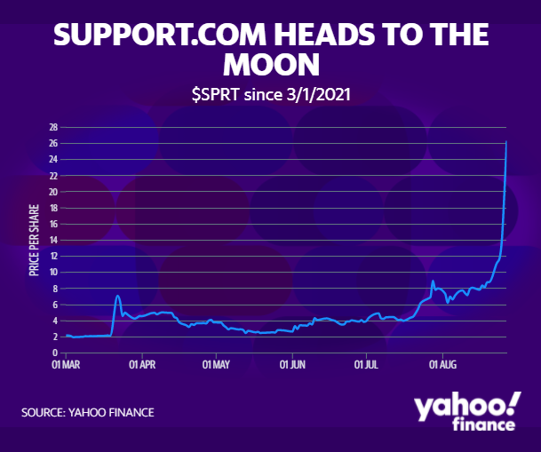 本月,Meme股军团又半路杀出程咬金。提供云软件和服务的公司Support.com $SPRT 突然冒出来,并赢得了Reddit用户的喜爱。理由很充分:它令人咋舌的收益率正迅速将游戏驿站挤到一边。Support.com的股价仅今年就上涨了1583%,这一涨幅刷新了游戏驿站同期1041%的涨幅。