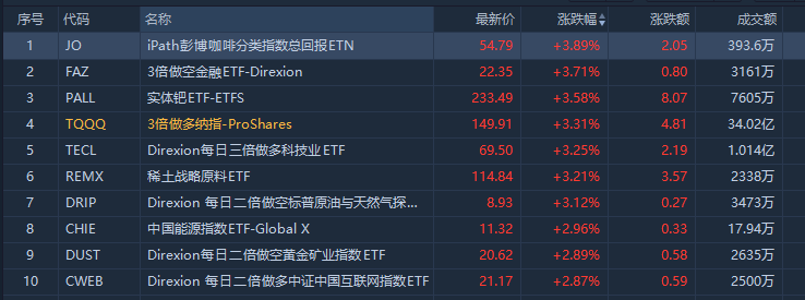 具体表现在ETF方面,涨幅靠前的ETF有3倍做空金融ETF $FAZ 上涨3.71%,成交额达3161万美元。