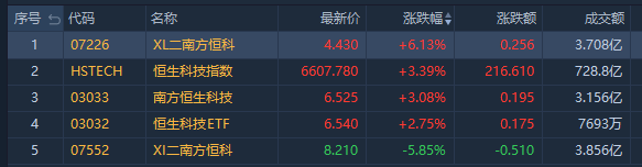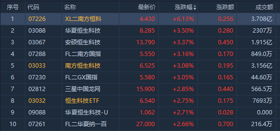 南方二倍做多恒科 $07226.HK 大涨6.13%%,成交额3.708亿港元;