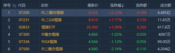 今日港股涨幅居前的恒指ETF有南方二倍看多恒指 $07200.HK 涨2.33%,成交额4.485亿港元;