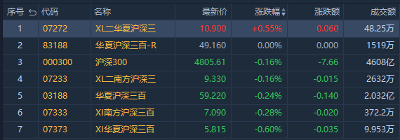 沪深300指数收跌0.16%。其中华夏二倍做空沪深三百 $07272.HK 上涨0.55%,成交额达48.25万港元。