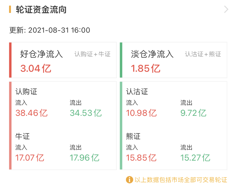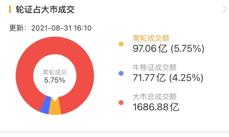 其中,窝轮总成交额97.06亿港元,牛熊证总成交71.77亿港元。