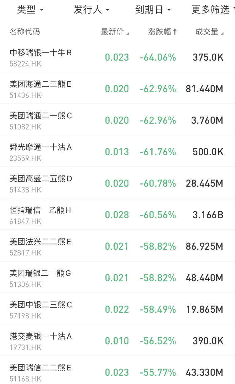 涨幅居前的包括: $22130.HK 海螺法兴一十购B涨118.75%,占据排行榜第一; $61168.HK 美团瑞银二三牛T涨114.29%,美团共有6只牛证涨超100%(含100%); $22704.HK 快手花旗二一购C涨112.00%。