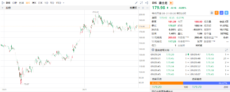 和环球影城一样,迪士尼业绩也一定程度遭受到疫情的影响,但因为其流媒体服务在疫情期间增长一度超出市场预期,多空交织下股价震荡上扬。在最近发布的第三季度财报(截至7月3日)中,迪士尼当季度总营收录得170.22亿美元,同比高增但依然没有回到2019年的水准。受益于全球客流量回升,迪士尼的乐园业务也在该季度扭亏为盈,不过“公园和产品”这一业务条线的体量仍远小于“媒体和娱乐”,仅为后者的十分之一左右。