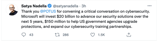 白宫峰会后,谷歌承诺在三年内投资超过100亿美元用于网络安全计算和软件项目,并对10万名美国人进行再培训。IBM表示,将在未来三年内帮助对至少15万人进行网络安全教育。微软CEO宣布,已经提供了1.5亿美元的技术援助,帮助美国联邦、州和地方政府升级其网络安全保护措施,还将在未来五年投资200亿美元。