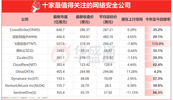 随着网络安全越来越受到科技公司和市场的关注,多只美股网络安全相关概念股的股价也是水涨船高。例如网络安全设备供应商飞塔信息(FTNT),今年股价迭创新高,年内涨超115%实现翻倍,最新市值超520亿美元。