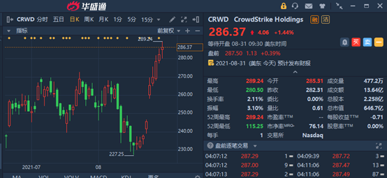 CrowdStrike在2020年股价飙升逾300%,今年年内也已累涨35%,最新股价报286.37美元。