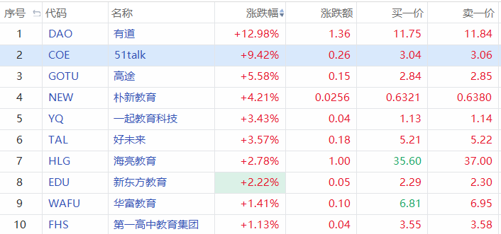 截至发稿,有道(DAO)涨12.98%,51talk(COE)涨9.42%,高途(GOTU)涨5.58%,好未来(TAL)、新东方教育(EDU)等均涨超2%。