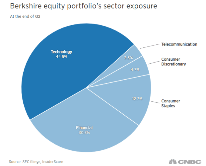仅在10年前,巴菲特的主要持仓股票中,除了IBM以外,几乎没有科技股。然而到目前为止,科技股已经成为伯克希尔哈撒韦的投资组合中最大的行业敞口。