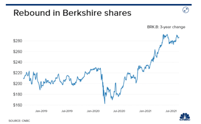 部分得益于股票回购,伯克希尔股票迅速走出了疫情冲击的阴霾,并反弹至历史高点。2021年年初至今,伯克希尔哈撒韦-B股价上涨了约23%。