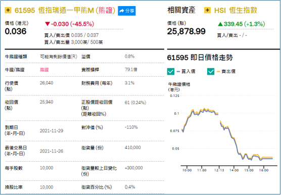 2、看错方向:恒指瑞通一甲熊(61595.HK),周二大跌45.5%。