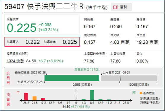 1、强势轮证:快手法兴二二牛(59407.HK),周二大涨43.31%;