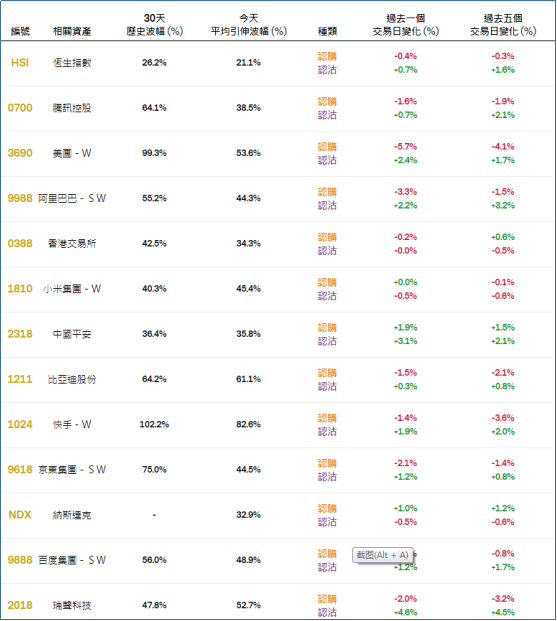 周二恒指相关权证的平均引伸波幅报约21.1%,按日小幅下跌0.7个百分点。个股方面,腾讯、美团、阿里相关认购证的引伸波幅按日下降;美团、阿里、平安相关认沽证的引伸波幅则按日上升。