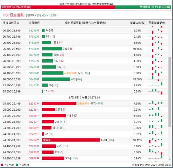 街货分布方面,至周二,恒指牛证街货在收回价24500点至25200点之间,累计相当约2650张期指合约;恒指熊证街货在收回价26000点至26500点之间,相当约1465张期指合约。