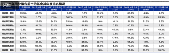 有人统计2011年前成立的所有398只主动型股票公募基金,近十年中每一年的排名后发现: