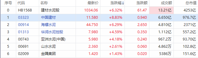 截至发稿,中国建材涨8.83%,报11.58港元每股,成交额6.65亿港元;海螺水泥涨6.29%,报44.75港元每股,成交额4.8亿港元;华润水泥控股涨4.59%;亚洲水泥涨4.18%。山水水泥、金隅集团跟涨呢。