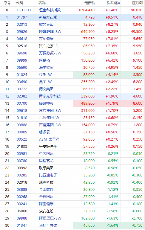 其中,新东方在线涨超9%,此前入选北京公布的首批学科类培训机构“白名单”,微盟集团、哔哩哔哩涨超8%,京东健康、汽车之家涨超7%,万国数据、网易涨超6%。快手涨超4%,现四连阳,美团涨超2%,腾讯、京东涨超1%。
