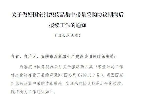 8月31日,业内流传《关于做好国家组织药品集中带量采购协议期满后接续工作的通知(征求意见稿)》的相关文件通知,为巩固国家组织药品集中采购改革成果,实现采购协议期满后平衡接续,文件提出6项要求。