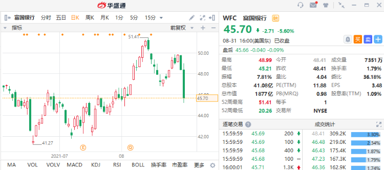 曾是“巴菲特最爱银行”的富国银行,可能要面临新的罚款或制裁了。此传闻一出,8月31日周二美股午盘后,该公司股价立马闪奔,盘中一度跌6.6%,创下自6月中旬以来的最大跌幅,市值蒸发111.37亿美元,约合720亿人民币。这与当日其他美国大型银行股价表现形成了鲜明对比,甚至远远跑输大盘。