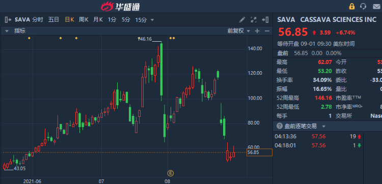 Cassava Sciences这家公司最近的日子不太好过,8月25日该公司股价收盘下跌31%至80美元,且此后也没能止住颓势,31日最新收盘价为56美元。